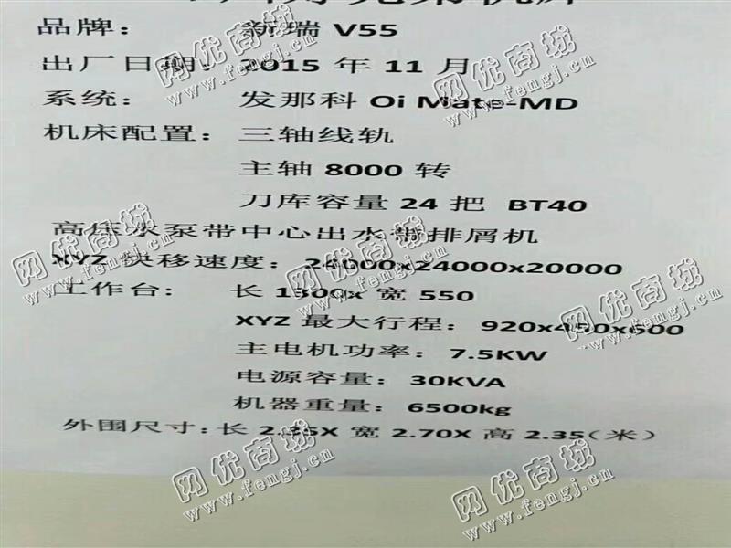 200000元(单价)出售1台V55立式加工设备,机器为江苏新瑞重工科技有限公司生产,立式加工设备是9成新、正常使用的机器,使用过程中无改装、无大修。目前立式加工设备位于江苏仓库存放,可以现场验货,有意者电话联系。