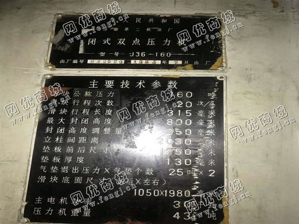 130000元(单价)出售1台J36-160闭式双点压力机,机器为济南二机床厂生产,闭式双点压力机是8成新、正常使用的机器,使用过程中无改装、无大修。目前闭式双点压力机位于广西仓库存放,有意者电话联系。