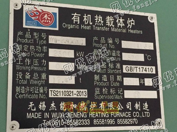 120000.00元(单价)出售二手天然气200万大卡导热油锅炉机器为无锡杰能加热炉有限公司制造生产,锅炉是、在位停用的机器,使用过程中无改装、无大修。目前锅炉位于广东广州仓库存放,可以现场验货,有意者电话联系。