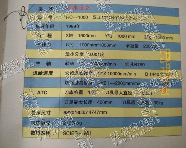 1100000.00元(单价)出售日本日立HC1000双工作台卧式加工设备机器为生产,日立加工设备是、正常使用的机器,使用过程中无改装、无大修。目前加工设备位于山东青岛仓库存放,可以现场验货,有意者电话联系。