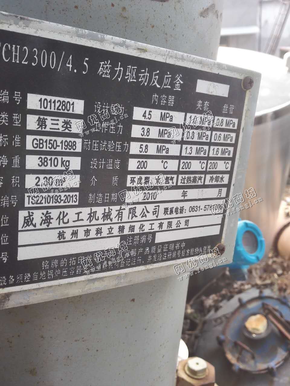 80000.00元(单价)出售2.3立方高压反应釜机器为生产,反应釜是8成新、正常使用的机器,使用过程中有改装、有大修。目前反应釜位于山东济宁露天存放,可以现场验货,有意者电话联系。