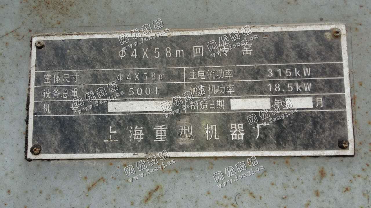 4x58米回转窑上海重型机器厂2003年10月制造,大、小齿轮八成新,筒体、轮带、托轮均可,主电机315KW,电控系统齐全,主减速机南京高精齿轮箱厂制造,整套设备齐全完好八成新,有图纸技术资料,价格:3300元/吨包装车