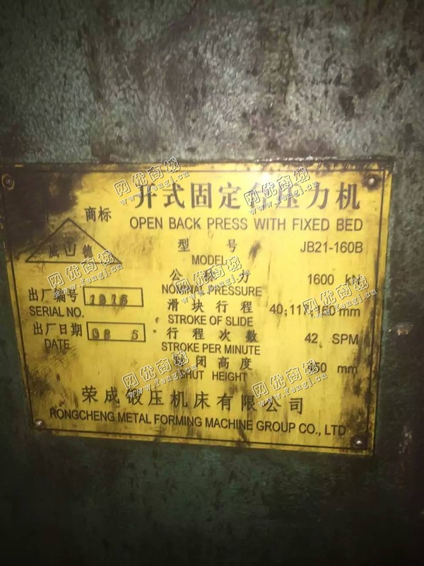 90000元(单价)出售二手JB21-160B开式固定台压力机一台,机器为荣成锻压机床厂生产,开式固定台压力机是7成新、正常使用的机器,使用过程中无改装、无大修。目前开式固定台压力机位于山东省仓库存放,可以现场验货,,有意者电话联系。
