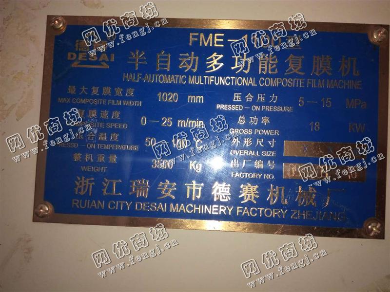 出售一台二手FME-1100的半自动多动能复膜机,大复膜宽度为1020mm,整机重量为3500Kg,浙江瑞安市德赛机械厂,2009年9月16日的,机器可以正常使用,有意者请联系