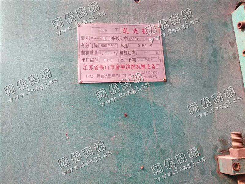 出售一台二手100T的轧光机,型号是MH-200,外形 尺寸为4800*2800mm,有效门幅为1800-2800。江苏省锡山市金荣纺织机械设备厂生产,2007年6月制造,有意者请联系
