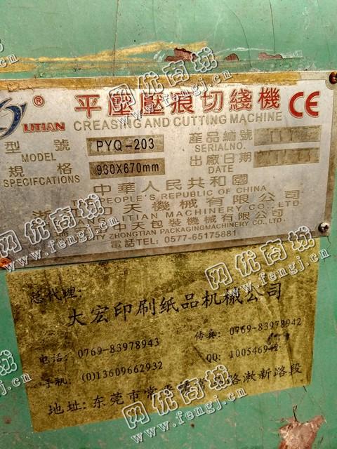 出售一台二手PYQ-203平压压痕切线机,规格930*670MM,价格1万6,2012年浙江力天机械有限公司生产,使用过程中无改装、无大修。8成新,目前位于广州仓库存放,可以现场验货,有意者电话联系。