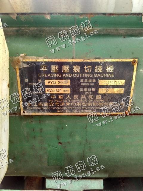 出售一台二手PYQ203C平压压痕切线机,规格930*670MM,价格1万5,2000年浙江瑞安市远东印刷包装机械有限公司生产,使用过程中无改装、无大修。8成新,目前位于广州仓库存放,可以现场验货,有意者电话联系。