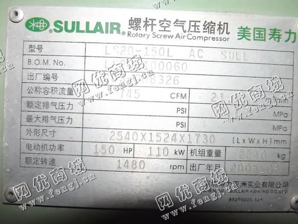 出售一台二手LS20-150L螺杆空气压缩机,价格9万,2005年美国寿力空压机有限公司生产,使用过程中无改装,无大修,7成新,目前位于浙江台州仓库存放,可以现场验货,有意者电话联系。