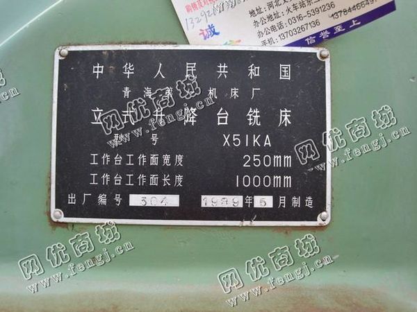 出售一台二手X51KA立式升降台铣床,工作台工作面宽度250mm,工作台工作面长度1000mm,1989年青海一机床厂生产,价格1.5万,使用过程中无改装、无大修。7成新,目前位于河北廊坊露天存放,可以现场验货,有意者电话联系。