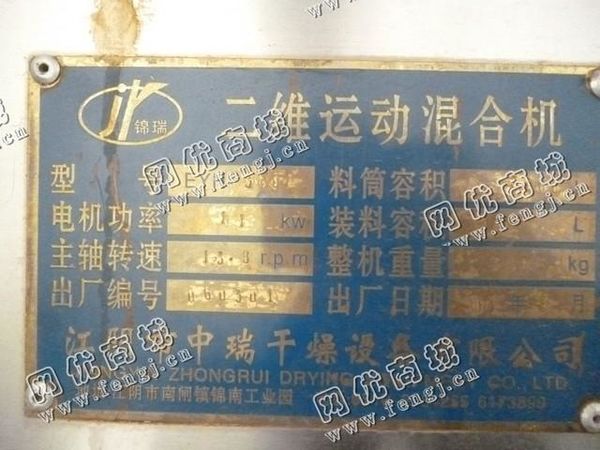 出售一台二手WYH-300二维运动混合机,2006年江阴市中瑞干燥设备有限公司生产,价格5万,使用过程中无改装,无大修,7成新,目前位于山东济宁露天存放,有意者可电话联系。