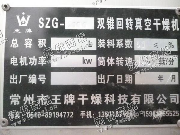 出售一台二手SZG-2000双锥回转真空干燥机,2003年常州市干燥科技有限公司生产,价格3.5万,使用过程中无改装,无大修,7成新,目前位于山东济宁露天存放,有意者可电话联系。