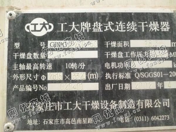 出售一台二手GDPG2200/6C工盘式连续干燥机,2002年石家庄市工大干燥设备制造有限公司生产,价格8万,使用过程中无改装,无大修,7成新,目前位于山东济宁露天存放,有意者可电话联系。