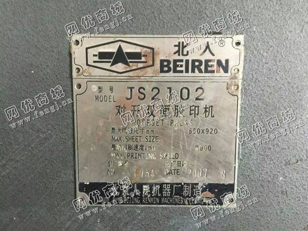 出售一台二手JS2102双面对开胶印机,2007年8月北京人民机器厂制造,大纸张尺寸mm:650*920,高印刷速度iph:9000,价格130000元,使用过程中无改装,无大修,七成新,目前位于河北廊坊仓库存放,可以现场验货,有意者电话联系。