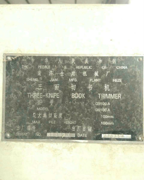 出售一台二手菏泽生建QS110A自动三面切书机,2007年12月山东省菏泽生建机械厂制造生产,价格50000元,使用过程中无改装,无大修,七成新,目前位于河南郑州仓库存放,可以现场验货,有意者电话联系。