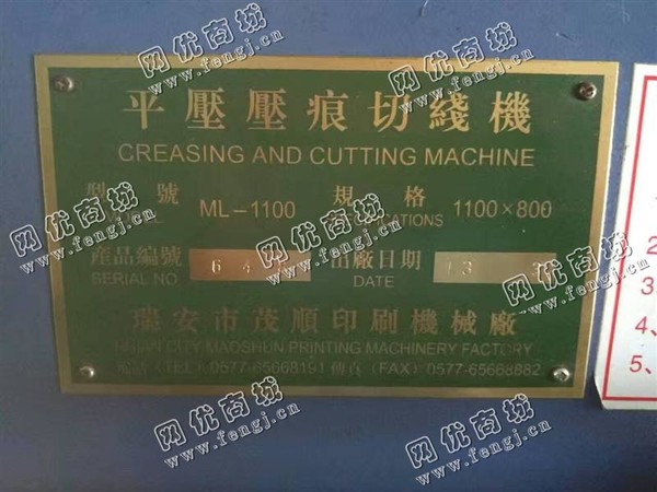 出售一台二手茂顺1100压痕机,2013年瑞安市茂顺印刷机械厂制造生产,价格23000元,使用过程中无改装,无大修,八成新,目前位于江苏常州仓库存放,可以现场验货,有意者电话联系。