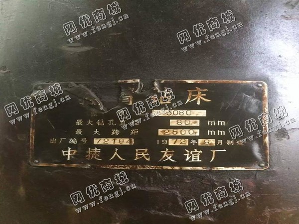 出售1台二手中捷Z3080摇臂钻床,中捷人民友谊厂1972年产,大钻孔直径80mm,大跨距2500mm,7成新,售价4.18万/台,使用过程中无改装,无大修,存放于安徽合肥仓库中,在位停用,欢迎现场验货,可试机,有意电联!