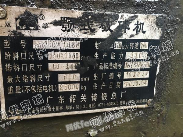 出售一台二手双拳750*1060颚式破碎机,2010年广东韶关双拳铸锻总厂,价格20万,使用过程中无改装,无大修,8成新,目前位于广西南宁,露天存放,可以现场验货,有意者电话联系。