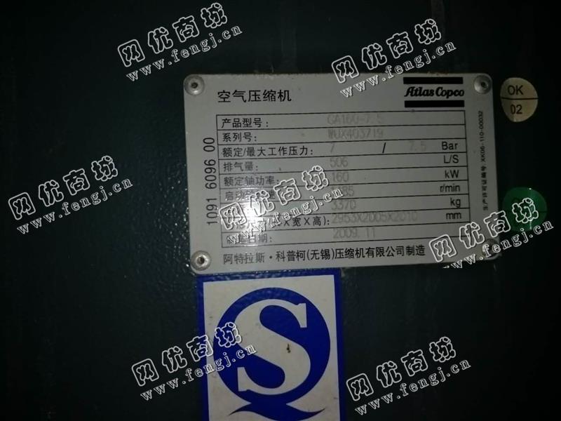 出售一台二手阿特拉斯GA160空气压缩机,2009年阿特拉斯压缩机有限公司生产,价格8万,使用过程中无改装,无大修,7成新,目前位于山东淄博,仓库存放,可以现场验货,有意者电话联系。