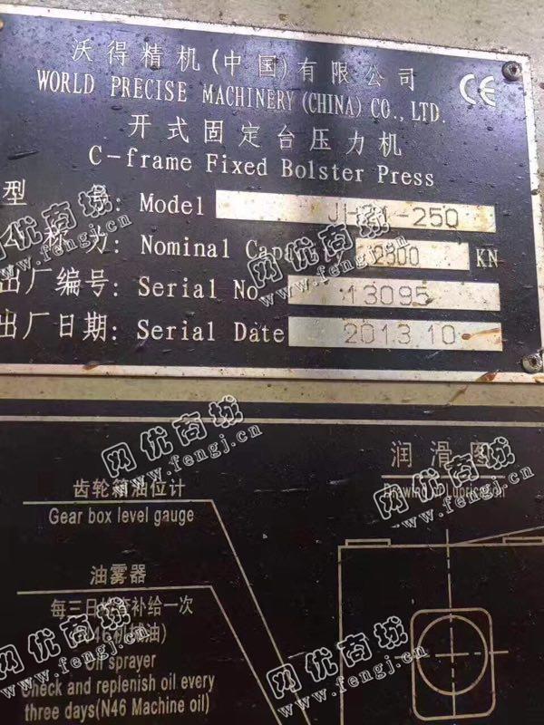 200000元(单价)出售一台二手JH21-250开式固定台压力机,机器为沃得精机(中国)有限公司生产,沃得精机(中国)有限公司开式固定台压力机是8成新、在位停用的机器,使用过程中无改装、无大修。目前开式固定台压力机位于山东仓库存放,可以现场验货,支持试车,有意者电话联系。
