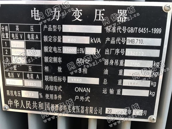 55000元(单价)出售湘潭产S11-800KVA/35变压器一台,机器为湖南湘潭华生变压器公司生产,湖南湘潭华生变压器公司变压器是9成新、正常使用的机器,使用过程中无改装、无大修。目前变压器位于河南仓库存放,可以现场验货,有意者电话联系。