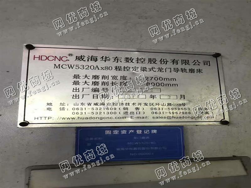 1350000元(单价)出售MCW5320A*80程控定梁式龙门导轨磨床,机器为威海华东数控股份有限公司生产,威海华东数控股份有限公司程控定梁式龙门导轨磨床是9成新、在位停用的机器,使用过程中无改装、无大修。目前程控定梁式龙门导轨磨床位于浙江仓库存放,可以现场验货,支持试车,有意者电话联系。