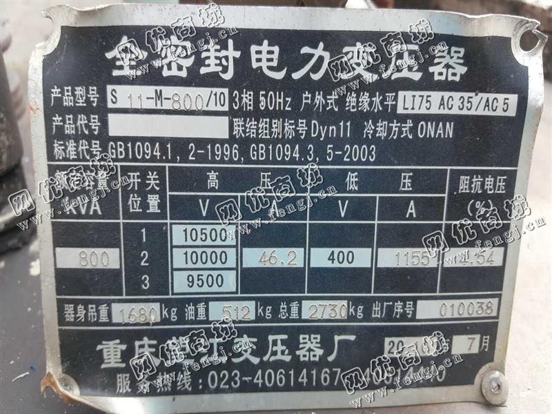 出售一台S11-M-800/10变压器,1.品质量完好,精度好,8-9成新,机器能够正常运行,附件无损坏,安装能用,无需维修。 2.买方负责运费及拆装装车费,卖方需提供现场试车环境,卖方不开票,只可现金交易.