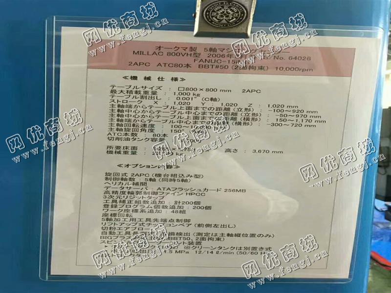 出售一台OKUMA 5軸加工设备 MILLAC 800VH 、2006年制 规格:系统FANUC-15iMB 工作台:800x800mm、2APC 工作台大承重:1000kg 、0.001°(C軸)分度 X:1020 Y:1020 Z:1020mm A:150度 (旋回角度) ATC80本 BBT50 (2面拘束)  主轴转数:10000rpm、设备出水